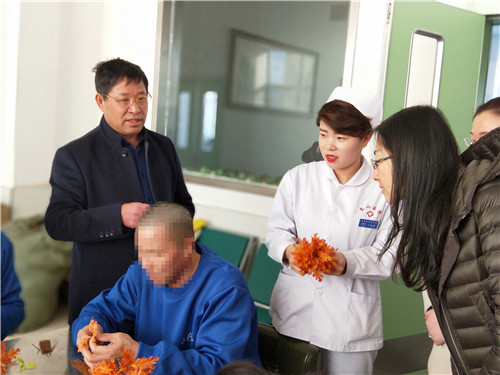 1月10日,东港市副市长张美华到东港市残疾人康复托养中心参观精神残疾人辅助性就业工作,张市长仔细观看了精神残疾人制作手工艺花和开展文体活动,对中心内精神残疾人的良好康复情况生活、工作情况表示赞许。